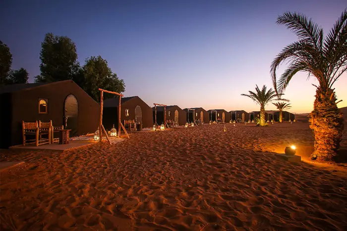 Llegada al campamento de lujo con haimas con baño privado, cena y música bereber bajo las estrellas.