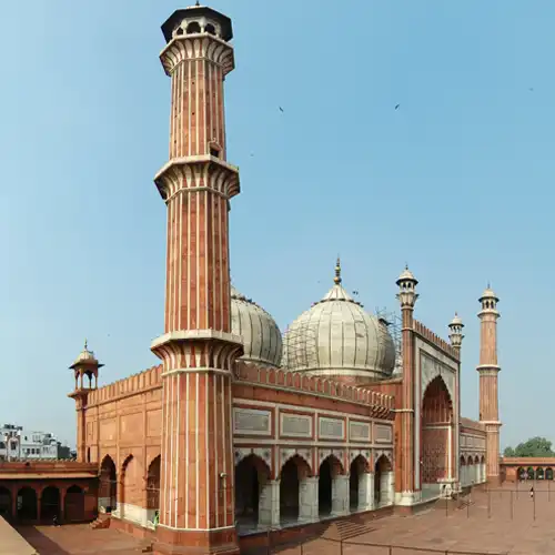 Panoramic view of Red Fort, visit Jama Masjid, Raj Ghat, Agrasen Ki Baoli, Government Buildings along Raj Path, and India Gate.